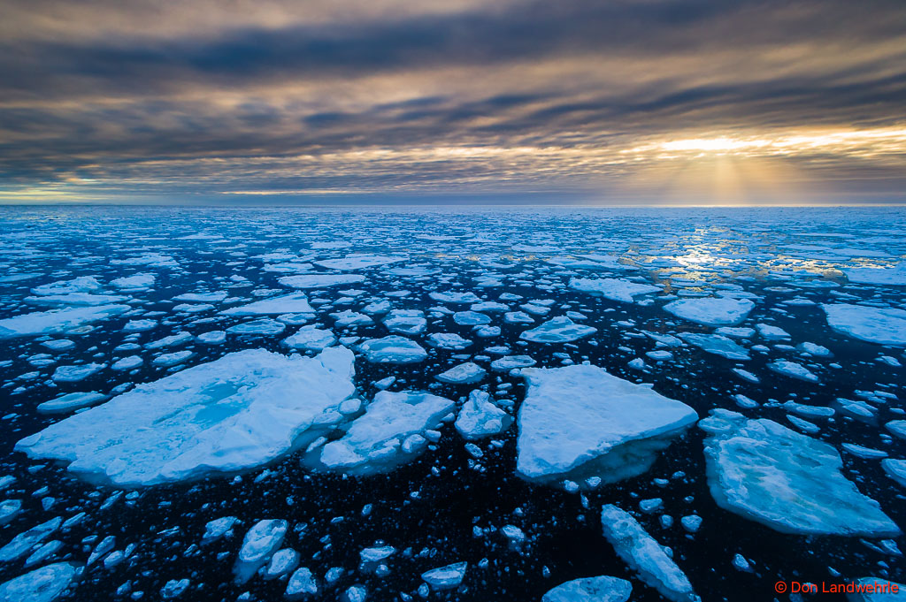 Sun streakiing through clouds over a frozen landscape of floating ice.