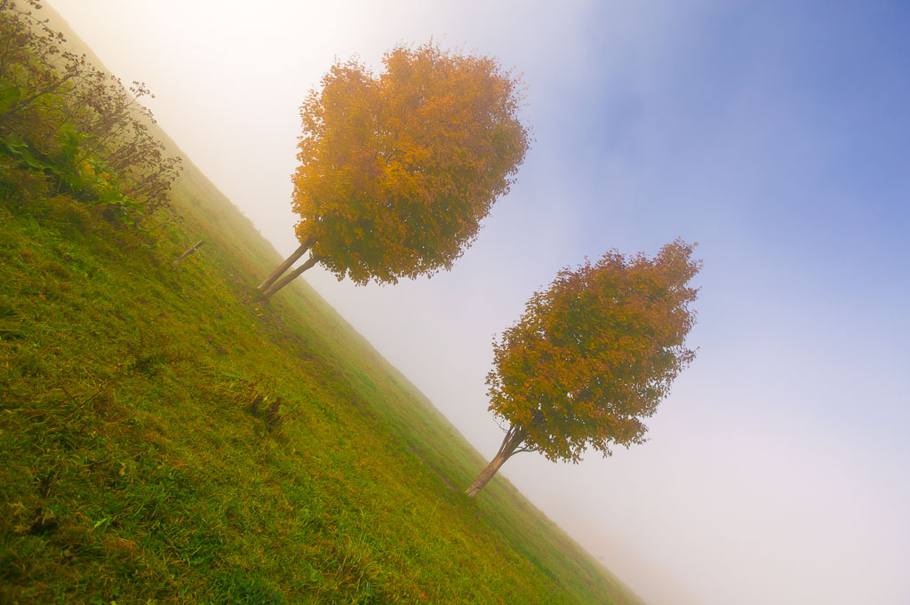 Two maple trees on a foggy autumn morning