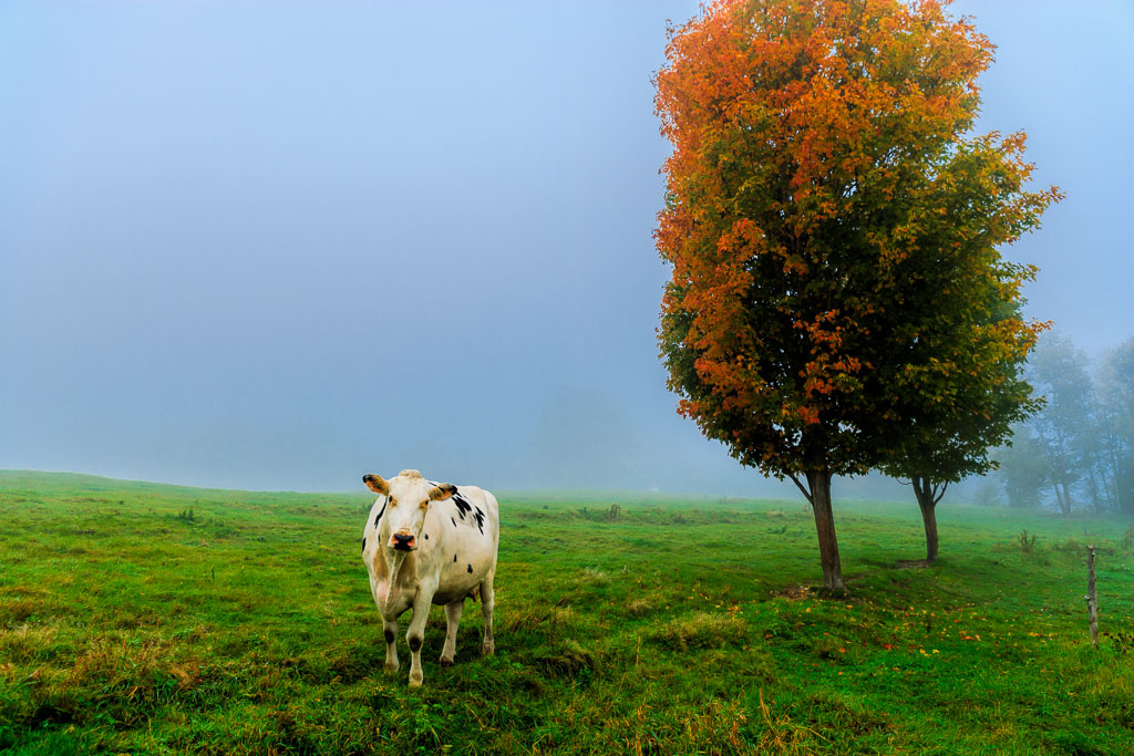 Cow in a field on a foggy morning.