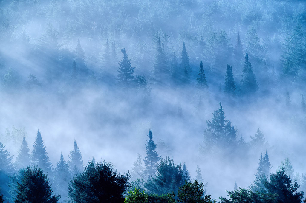 Looking over fog covered trees, Stowe, Vermont, USA